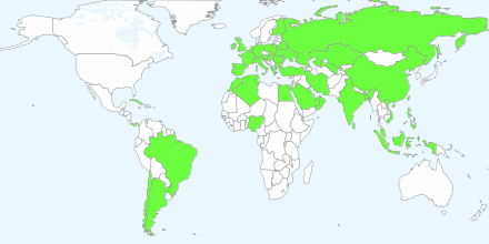 Europe: Albania Austria Belgium Belarus Bulgaria Croatia Finland France Gibraltar Great Britain Greece Ireland Italy Malta Moldova Netherlands Poland Portugal Romania Russia San Marino Serbia Slovakia Slovenia Spain Switzerland
